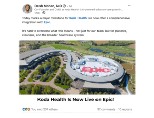- Role-Based Messaging: We collaborated with each executive to craft tailored posts highlighting different facets of the integration from operational impact to patient outcomes, ensuring the news resonated across partner, provider, and investor audiences.